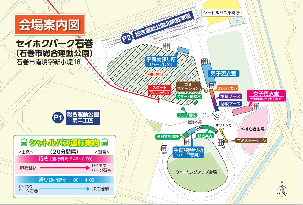 マラソン大会会場の案内図を掲載いたします。 スタート地点とゴール付近は大変混雑いたしますので、グループ・ご家族などでお越しの際はあらかじめ集合場所を 決めていただき、はぐれないようにご注意ください。